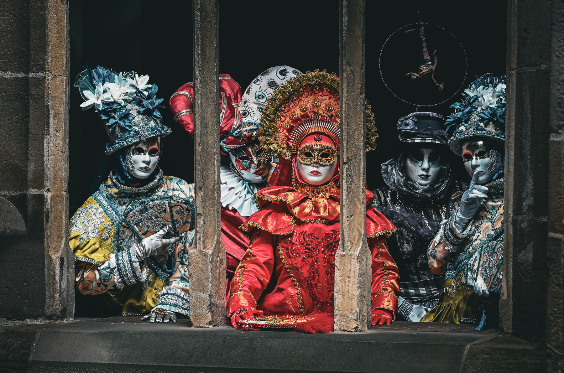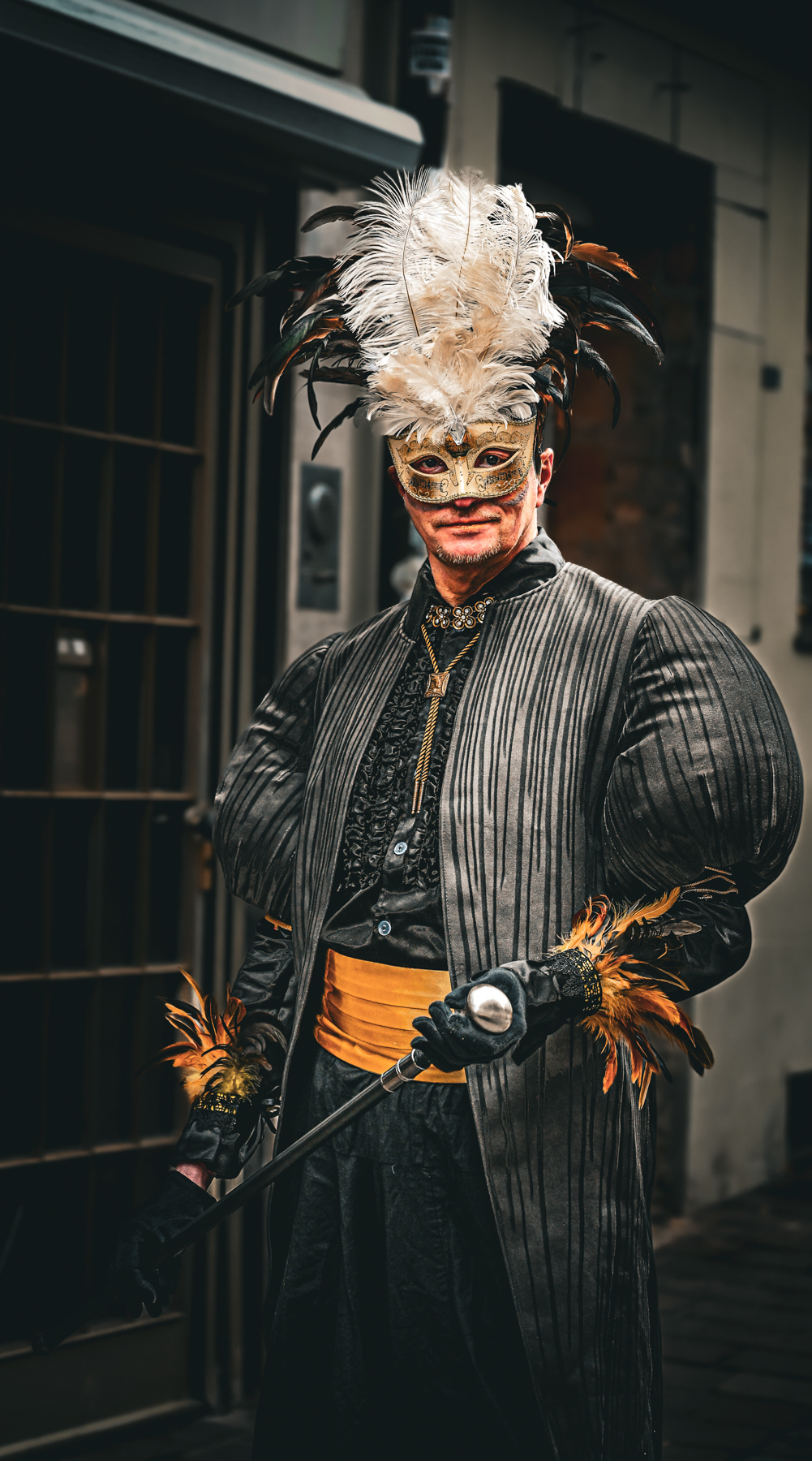 Der Samstag führte uns nach Öhringen, wo wir ein exklusives Shooting mit der Gruppe um Metta erleben durften. Achtzehn Maskenträger standen uns gegenüber – elegant, bunt, unverwechselbar. Vor einer traumhaften Kulisse fotografierten wir die Künstler und erhielten einen besonderen Einblick in ihre Welt. Ob der Masken blieb zwar ein echtes Kennenlernen verborgen, doch genau diese Distanz verlieh jeder Begegnung eine besondere Faszination.