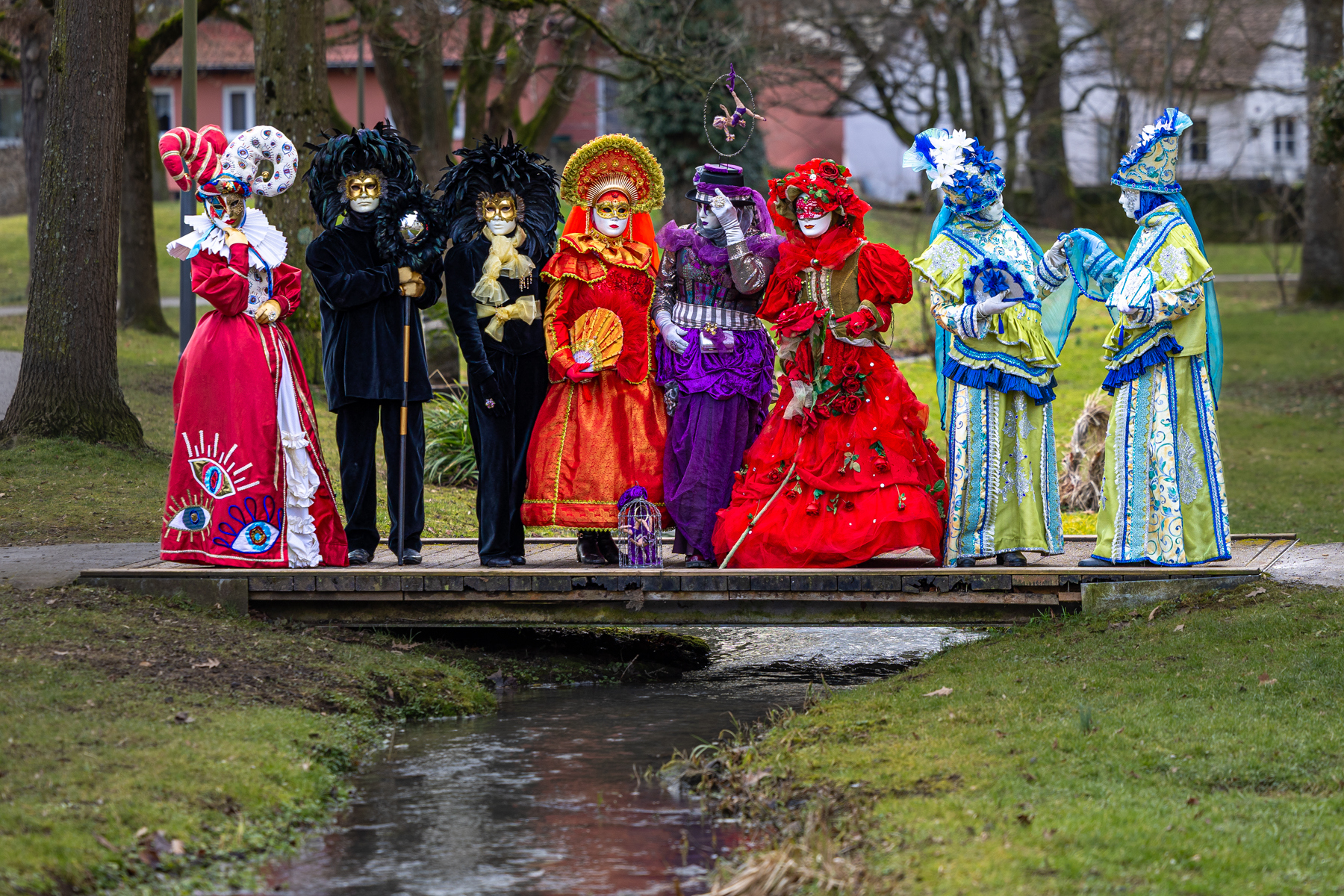 Der Samstag führte uns nach Öhringen, wo wir ein exklusives Shooting mit der Gruppe um Metta erleben durften. Achtzehn Maskenträger standen uns gegenüber – elegant, bunt, unverwechselbar. Vor einer traumhaften Kulisse fotografierten wir die Künstler und erhielten einen besonderen Einblick in ihre Welt. Ob der Masken blieb zwar ein echtes Kennenlernen verborgen, doch genau diese Distanz verlieh jeder Begegnung eine besondere Faszination.