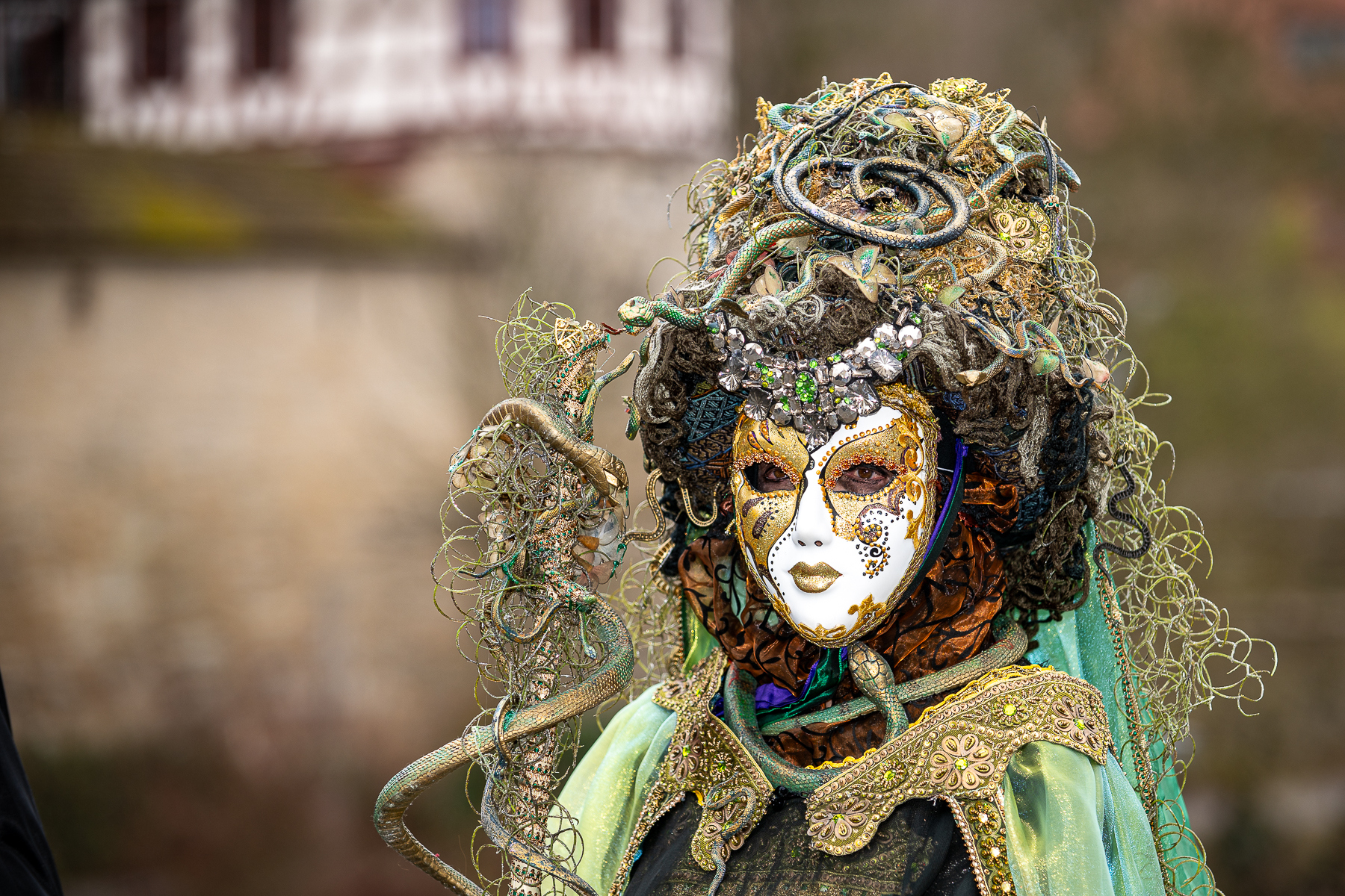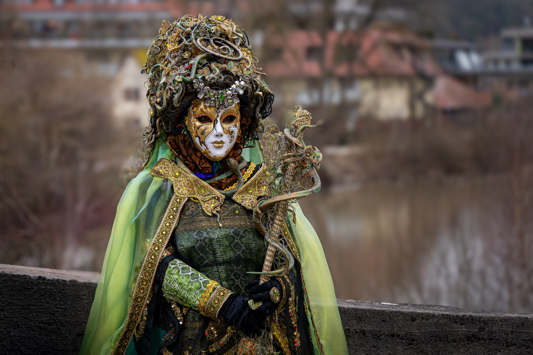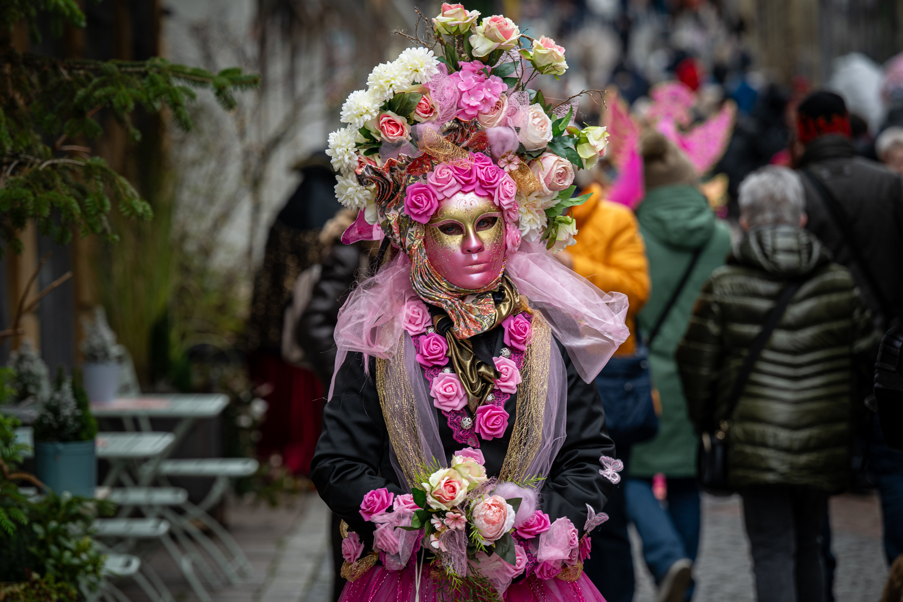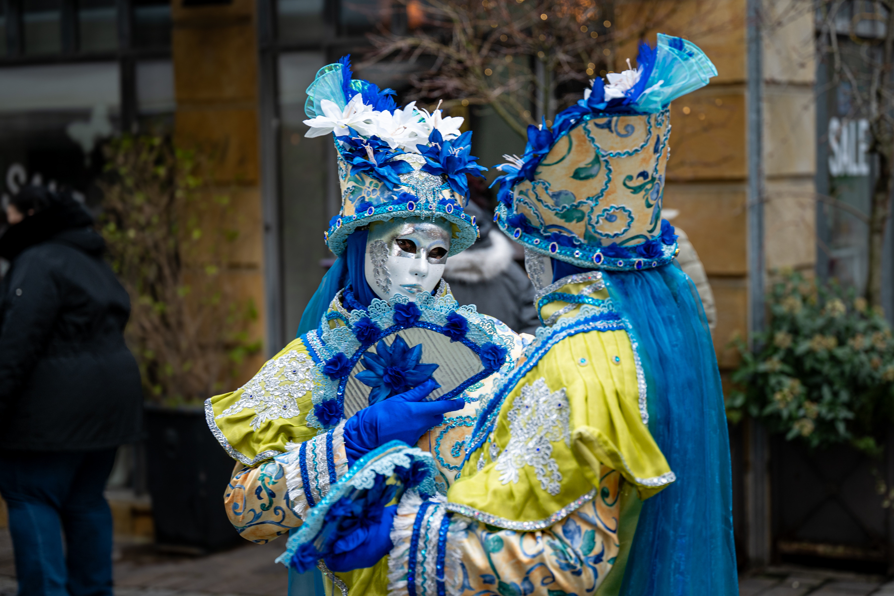 Der Samstag führte uns nach Öhringen, wo wir ein exklusives Shooting mit der Gruppe um Metta erleben durften. Achtzehn Maskenträger standen uns gegenüber – elegant, bunt, unverwechselbar. Vor einer traumhaften Kulisse fotografierten wir die Künstler und erhielten einen besonderen Einblick in ihre Welt. Ob der Masken blieb zwar ein echtes Kennenlernen verborgen, doch genau diese Distanz verlieh jeder Begegnung eine besondere Faszination.